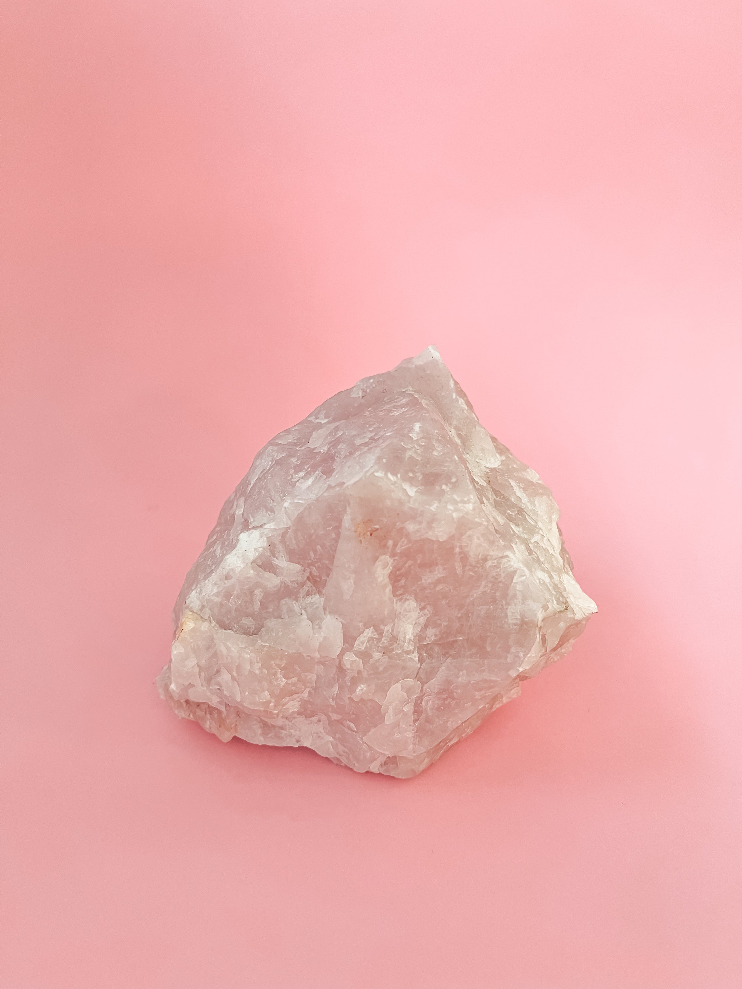 Este masivo de Cuarzo Rosa es una pieza única, creada de forma natural en el corazón de la Tierra a lo largo de millones de años. Sus delicados tonos rosados, que pueden variar desde matices suaves y lechosos hasta transparencias más intensas, hacen de cada ejemplar un cristal irrepetible.